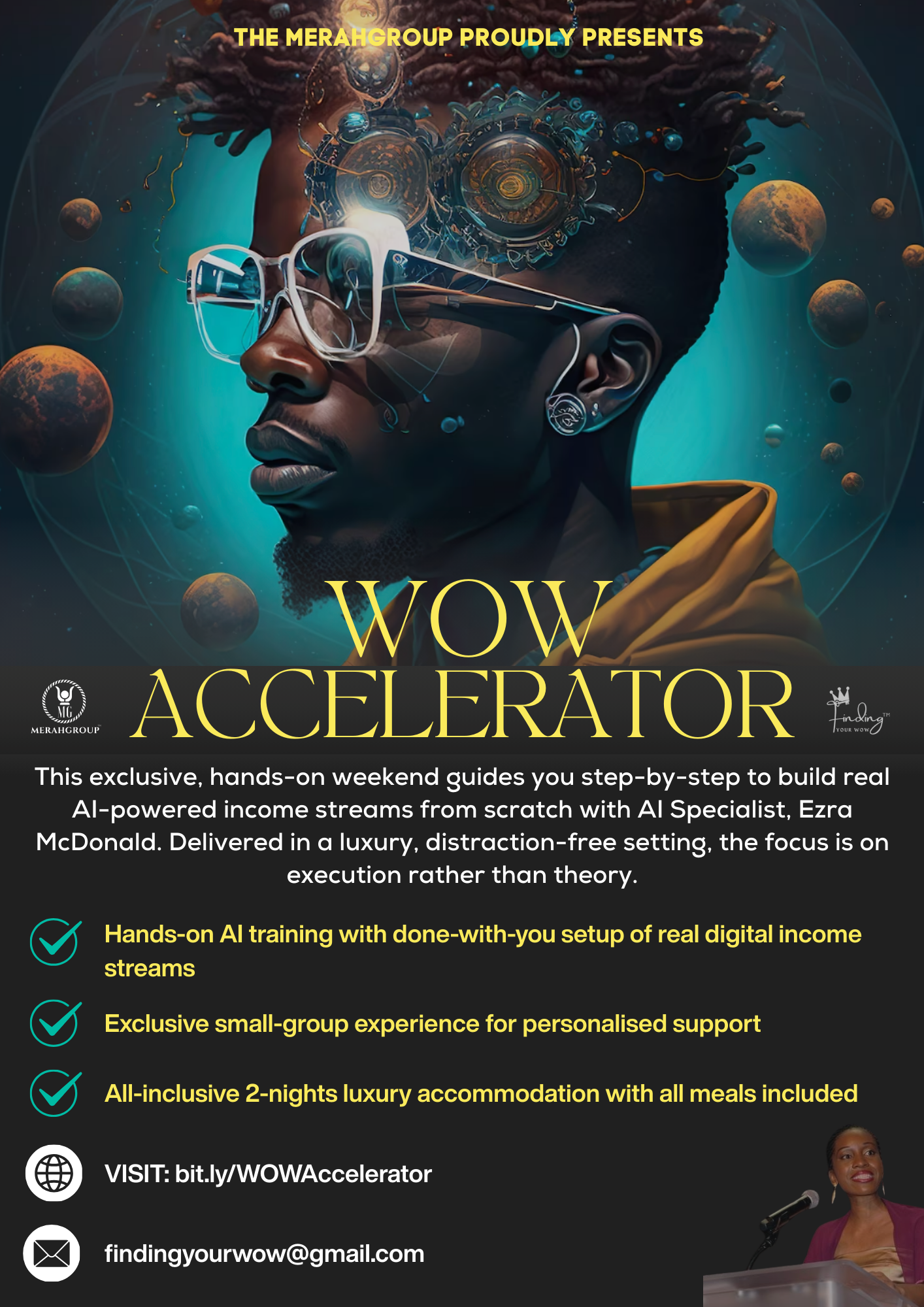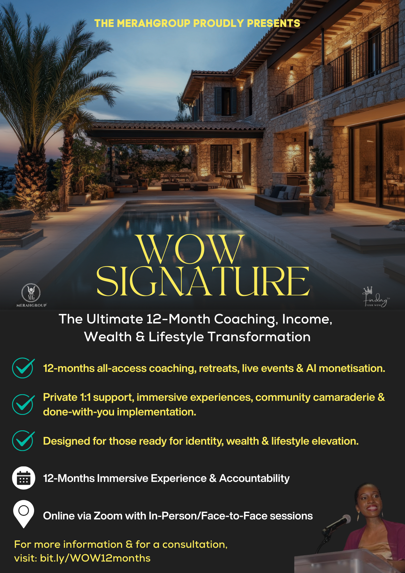 A 12-month immersive experience — combining private 1:1 support, community camaraderie, retreats, live events and AI monetisation.
