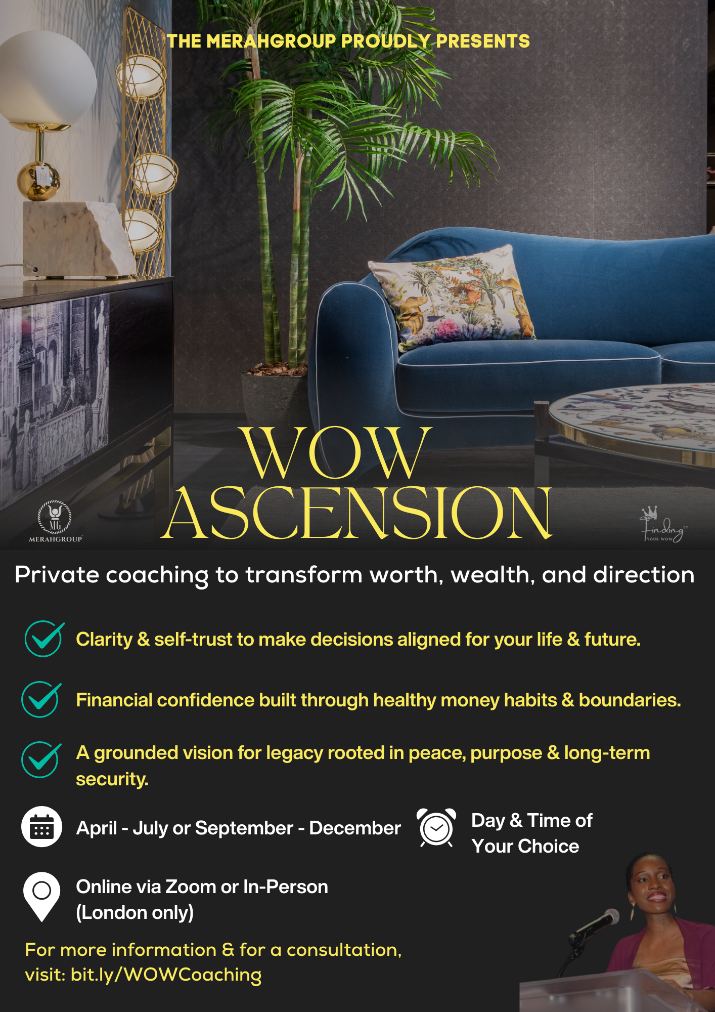 Private 1:1 coaching dedicated to your personal, professional and financial goals being achieved with greater speed, clarity, and confidence.