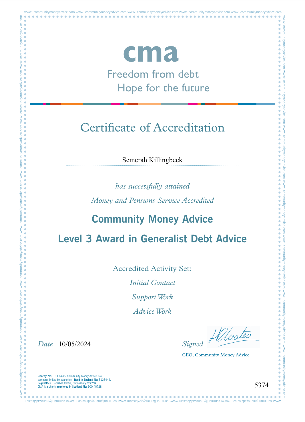 Certificate of Accreditation (Parts 1, 2 & 3), Level 3 Award in Generalist Debt Advice via Community Money Advice, May 2024.