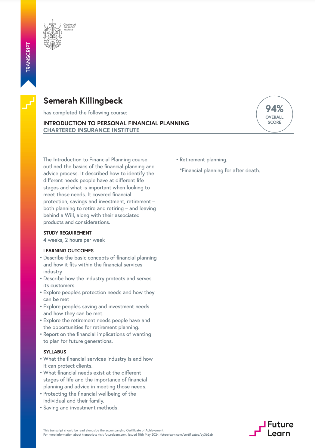 During the month of May 2024, Semerah completed this introductory course to Financial Planning.